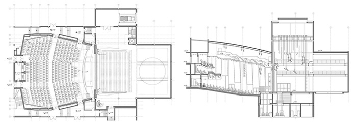 سالن تأتر تالار مرکزی اراک، پلان همکف و برش طولی