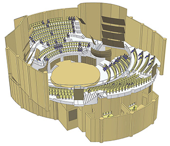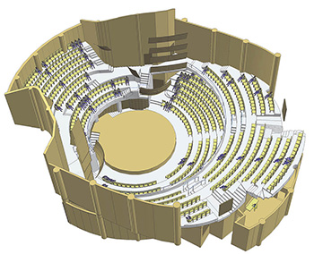 طرح حاضر با هماهنگی بخش‌های الکترواکوستیک، سازه، تأسیسات مکانیکی و الکتریکی و نیز ماشینری صحنه تأتر اجرایی شده است.